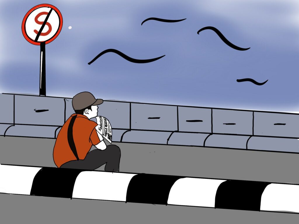 Seorang anak kecil duduk di pinggir trotoar dekat lampu lalu lintas dengan senyum lebar terukir di wajahnya. Ia menggenggam erat...