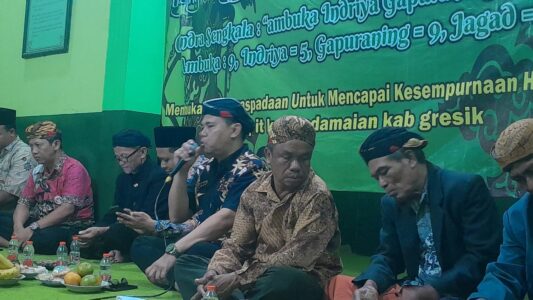 GRESIK – Perayaan 1 Sura 1959 Saka Jawa bertajuk “Membuka Kewaspadaan untuk Mencapai Kesempurnaan Hidup” diselenggarakan warga Penghayat Kepercayaan Sapta Darma di Sanggar Candi Busana Desa Slempit, Kecamatan Kedamean, Minggu (13/7/2025).